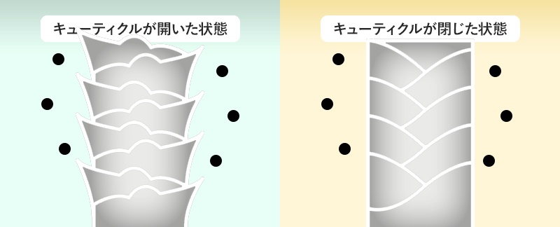 髪の毛はもともと弱酸性ですが、これがアルカリ性に寄ってしまうと、キューティクルが開いた状態になります。